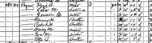 Floyd R Payne, Jennie’s brother, owns the house.  This is not typical for a 20 year old single male in this area. Floyd is listed as a farmer on a General Farm, and his two brothers, Thomas and Robert, are listed as laborers on a Farm, presumably the family farm.  None of the sisters are working and Lela and Jennie are in their 20’s.  So it would appear that the family is not destitute.