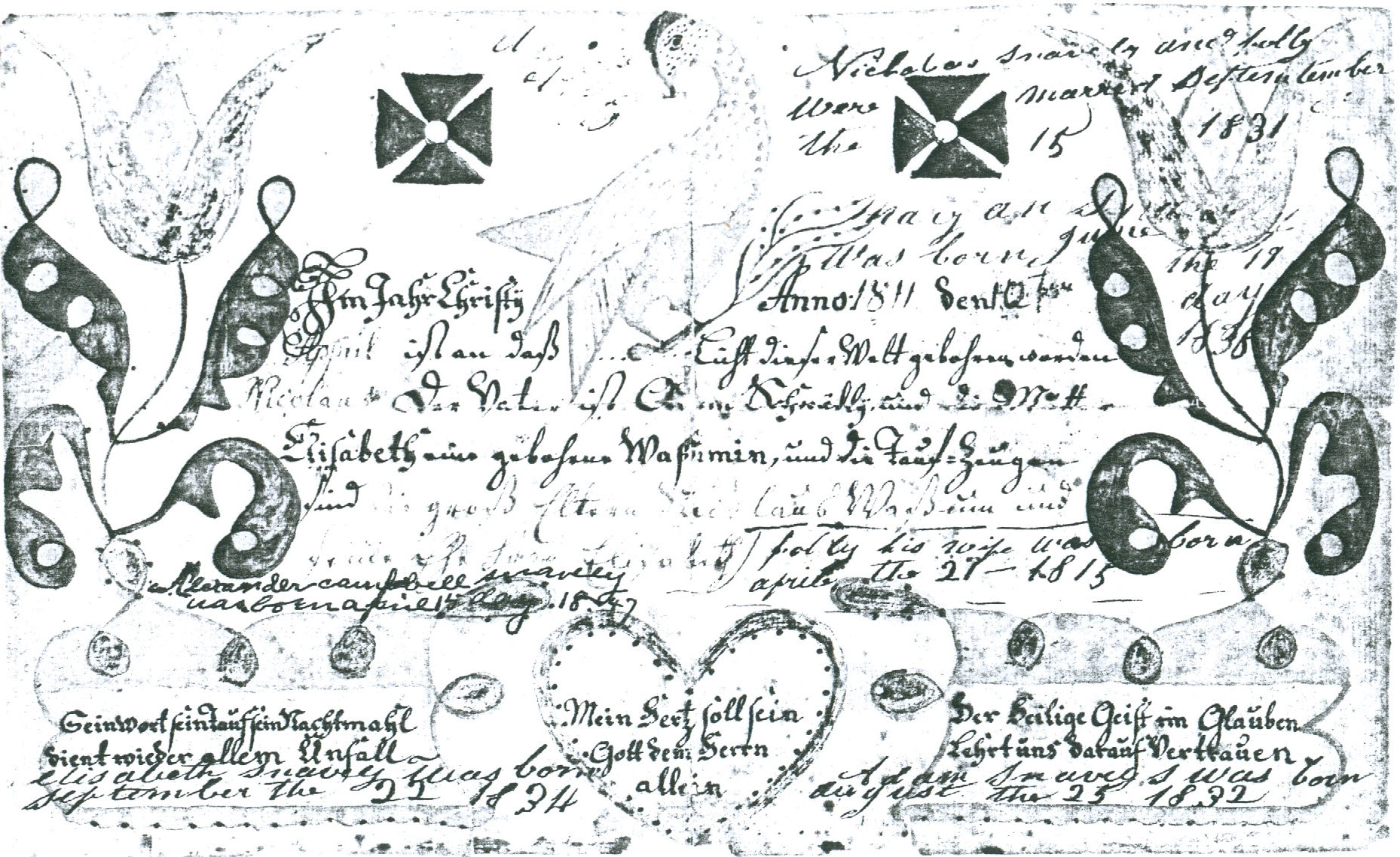 Copy of the Fraktur for Nicholas Snavely’s birth provided by Beverly Repass Hoch, CG 3