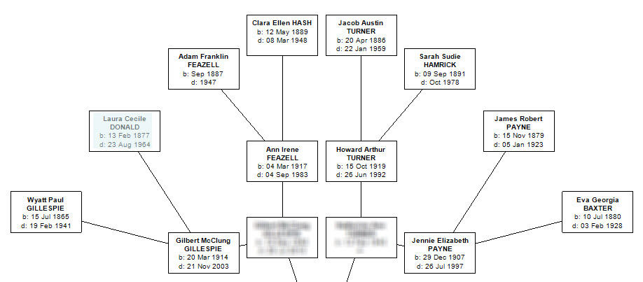 My great grandmother was Clara Ellen Hash. Her parents were Weldon Alexander Hash and Sarah Hash who were first cousins.[1] Their fathers were Zebedee Hash and Abram Hash, respectively.