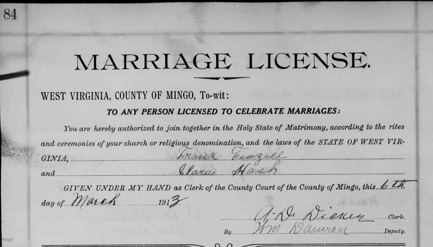 One day, up pops a shaky leaf for Clara. Ancestry.com had indexed West Virginia marriage records. And guess who was there? Clara and Adam. There were married March 6, 1913 in Williamson, Mingo County, West Virginia.[9] West Virginia has lots of vitals online, and lucky for me, the image was there.