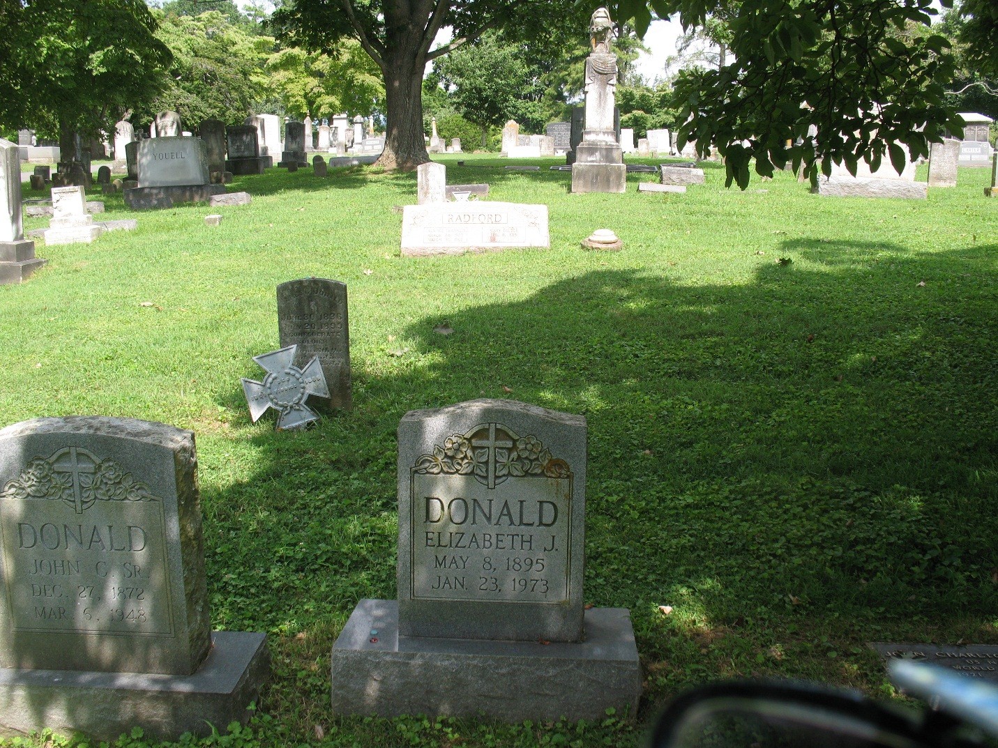 Her husband, James Calvin Donald,1 her son John Charlton2 and John’s wife Elizabeth3 and their two sons are buried in at Stonewall Jackson Memorial Cemetery in Lexington, Virginia. All in the same plot. You can see James Calvin Donald in the back with the Southern Cross. John C Donald Sr and Elizabeth J Donald in the front, and to the right out of the picture are John and Elizabeth’s two sons. Where is Elizabeth Wallace, wife of James? Mother of John?