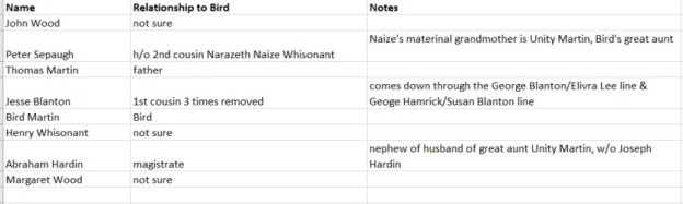 Twenty nine men signed this document. So how do I understand who they were? I’m going to start by relating them to one person, in this case Bird Martin, my 3rd great grandfather. Just something simple and just starting with my best guesses based on who I have in my tree: