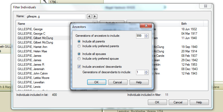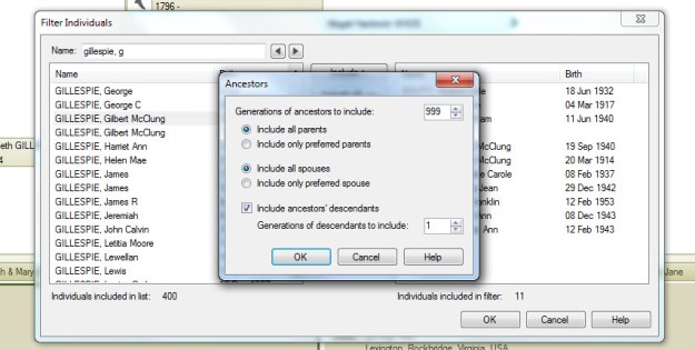 I selected his ancestors and included all parents and all ancestor’s descendants for 1 generation.